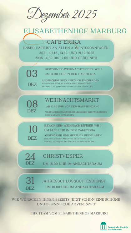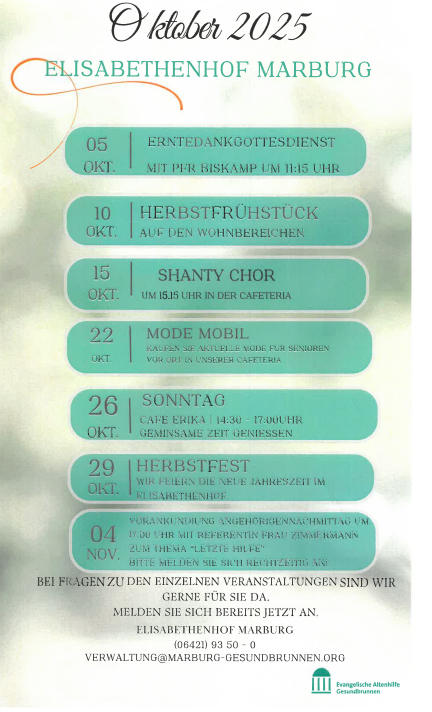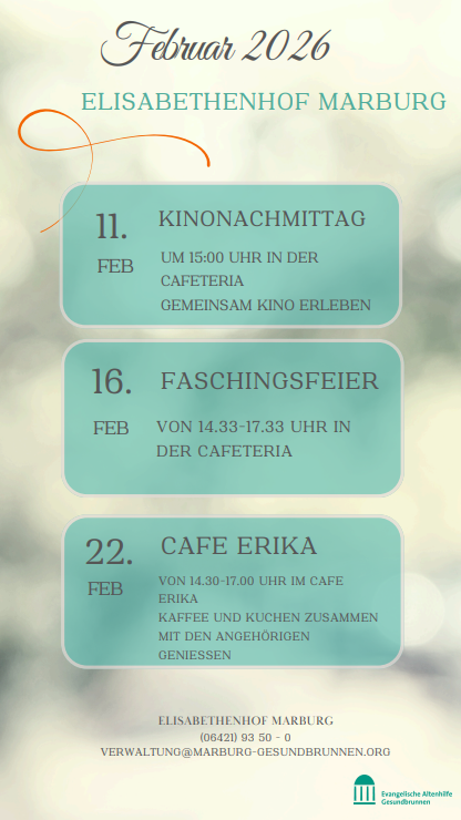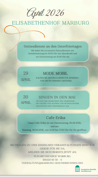 Hier finden Sie monatlich aktuelle Informationen, Veranstaltungen und Termine im Elisabethenhof Marburg.